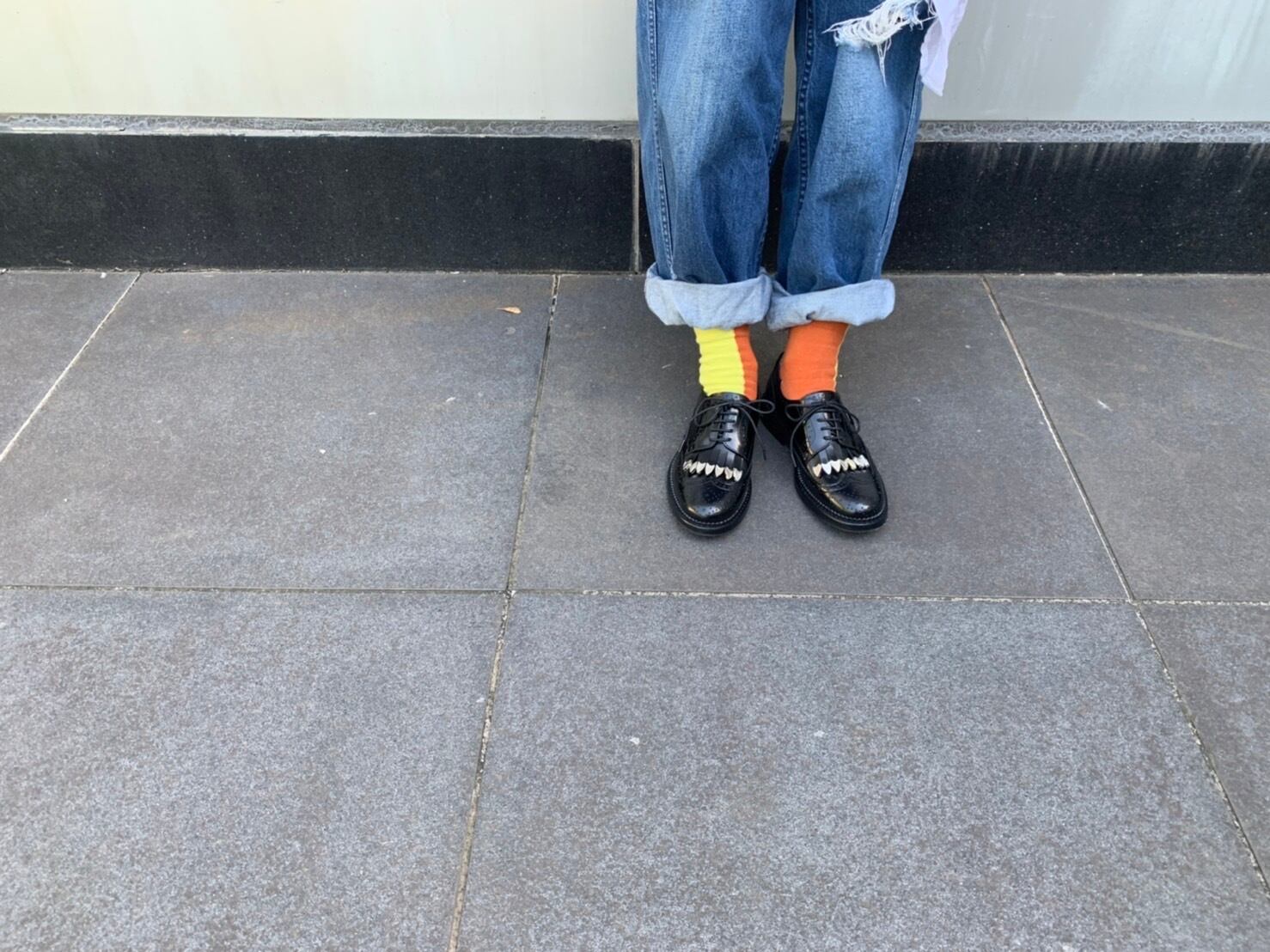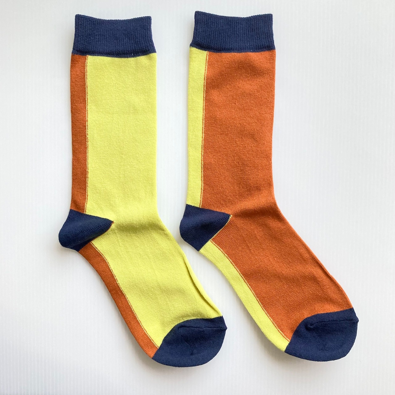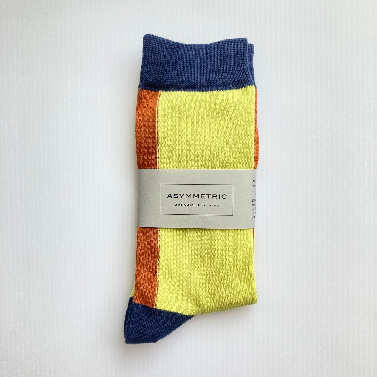 靴下ブランド hacuとのコラボで、デザインさせていただいた左右非対称のバイカラー靴下、「ASYMMETRIC」2021colorバージョン。
